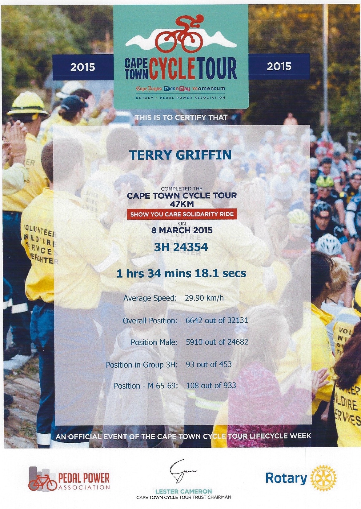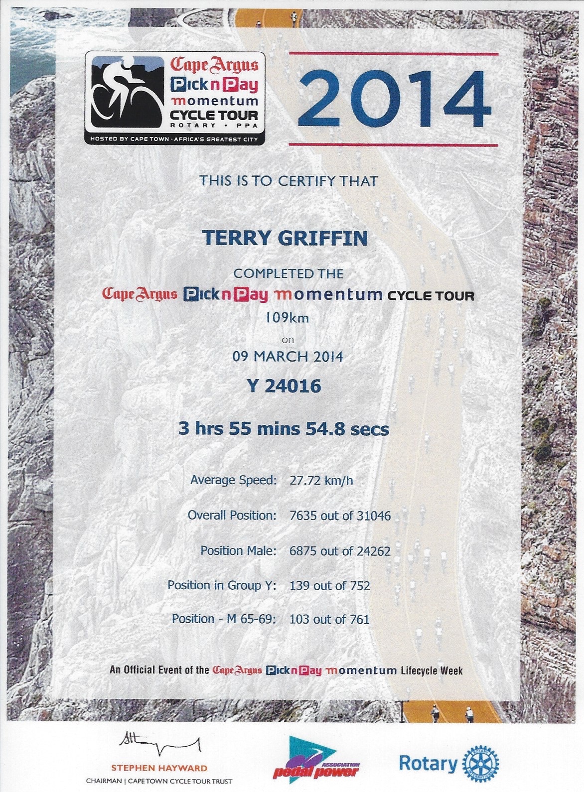 This was the first year that the Expo was held at the Cape Town Stadium, and it was pretty poor. I again drove up on the Saturday afternoon to Norma's house, where my brother Paul was back for a second year. I rode through to the start and set off at 7:17 on a beautiful day. Norma and I had a beer afterwards, but Paul was so far behind us that we didn't wait. It was also my worst ever overall position. We had a pleasant celebratory braai in the evening. As it happened, it was my last proper Argus!