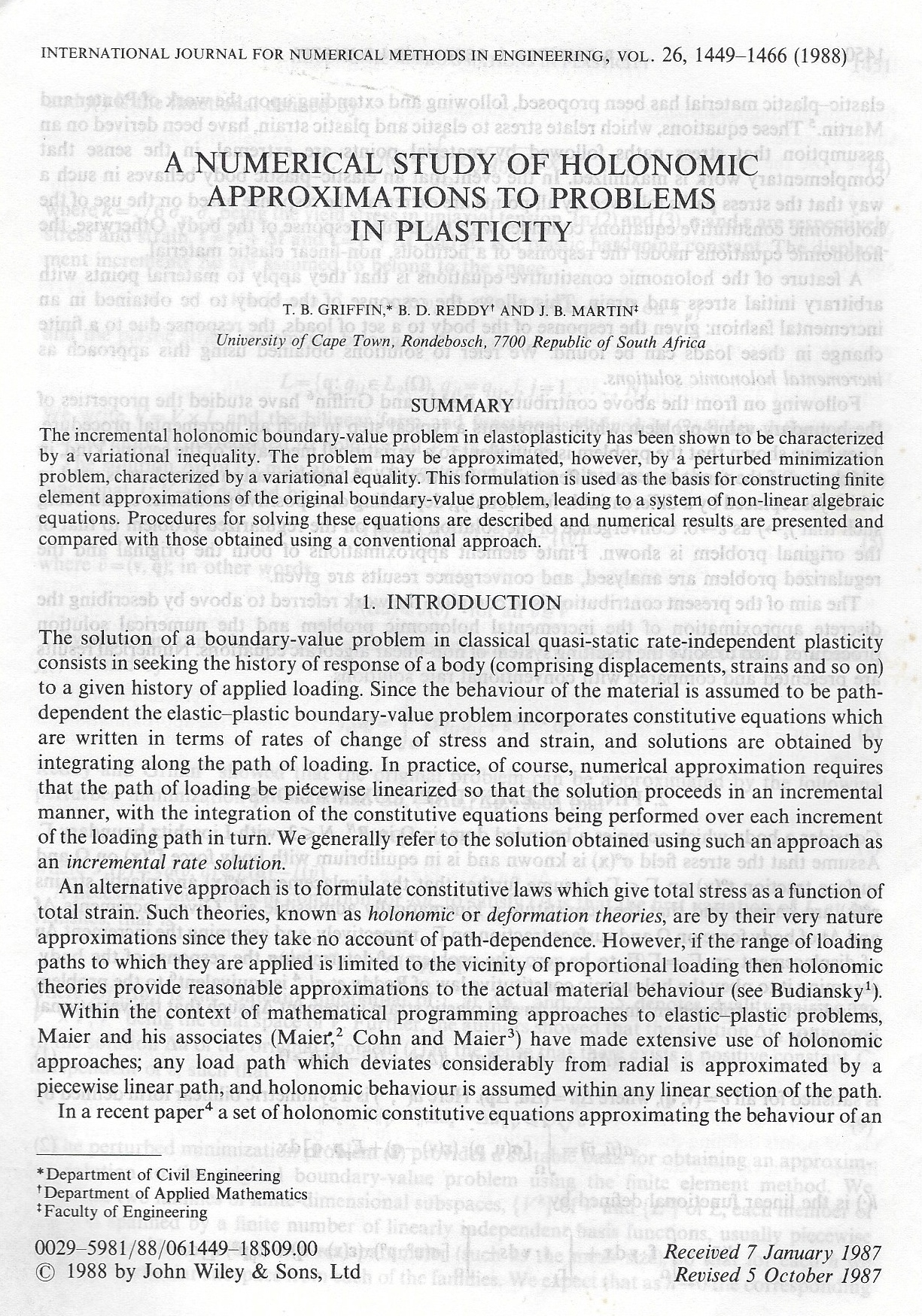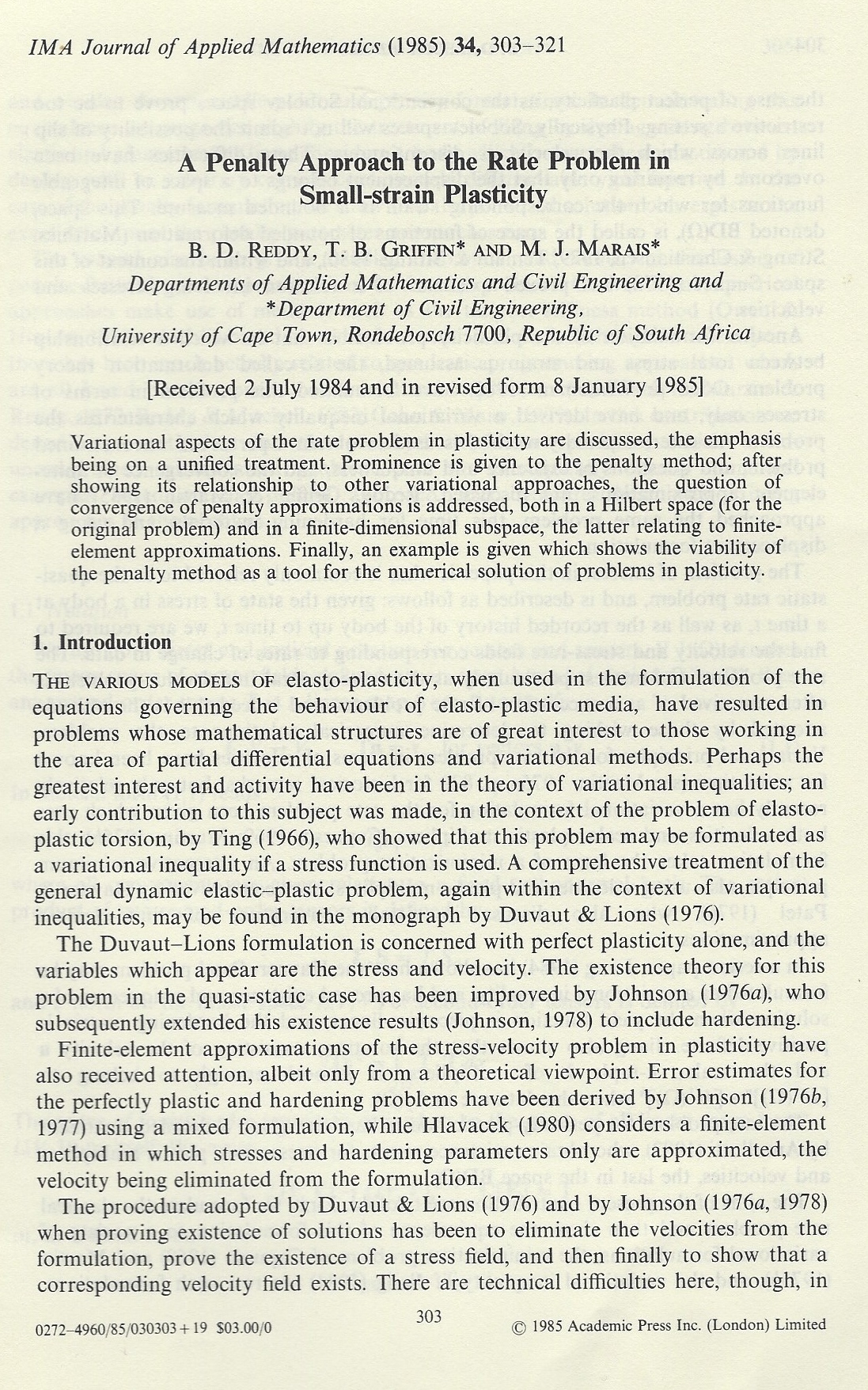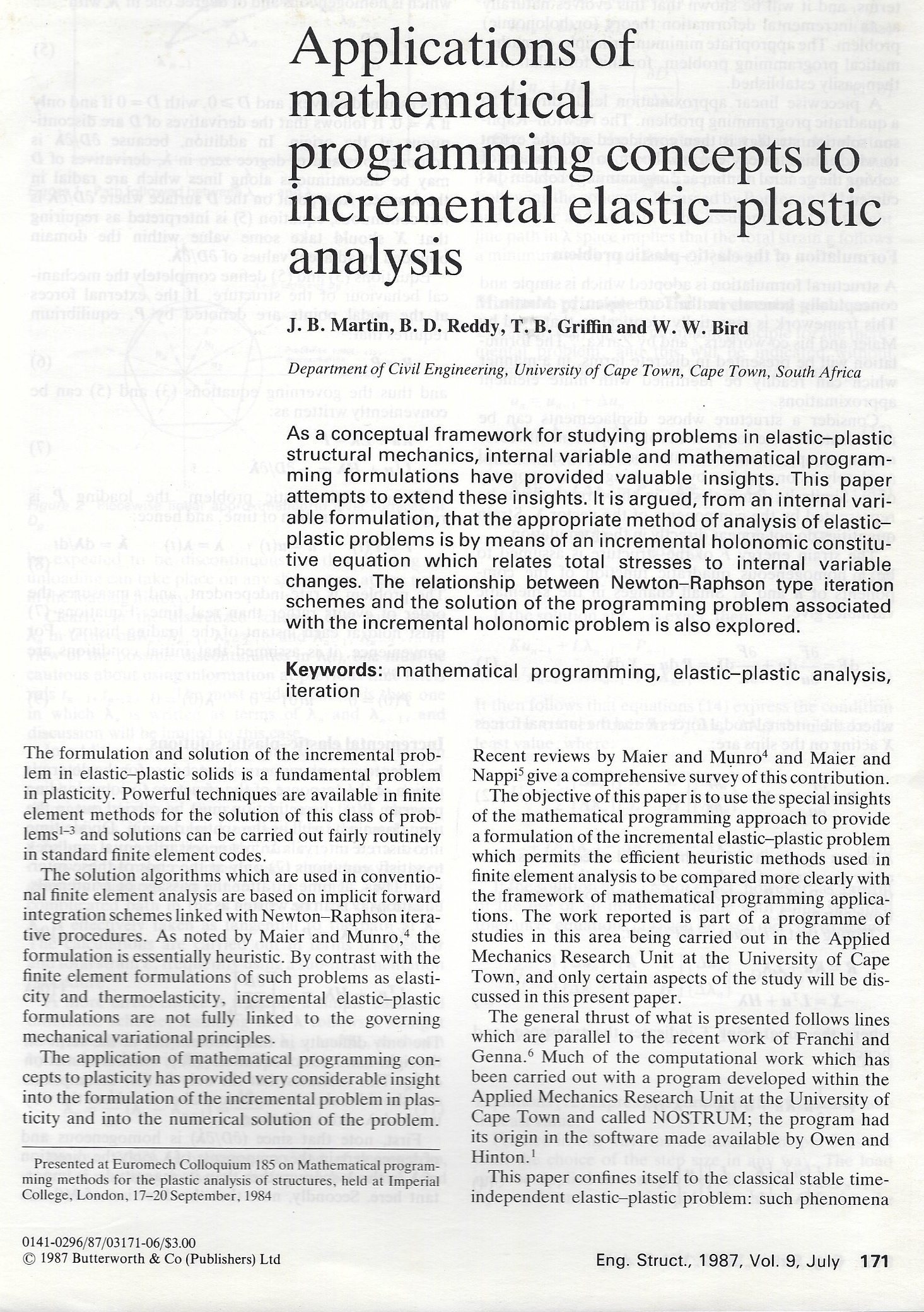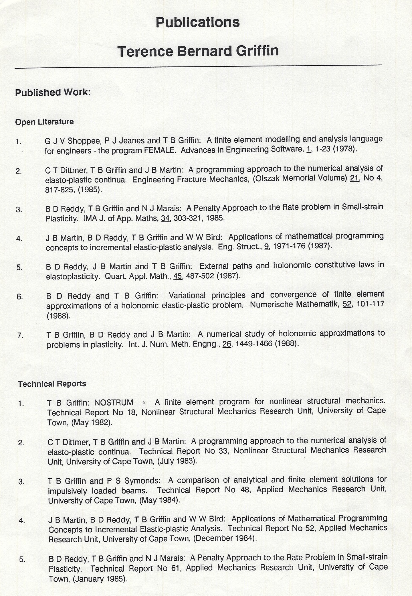 In February 1984 I resumed teaching at UCT and got stuck into my PhD with a vengeance. I had two supervisors: Professor John Martin (for engineering input) and Professor Daya Reddy, head of Applied Maths (for applied maths input). In fact, my PhD turned out to be more applied maths than engineering as the following selection of papers published in international journals show: