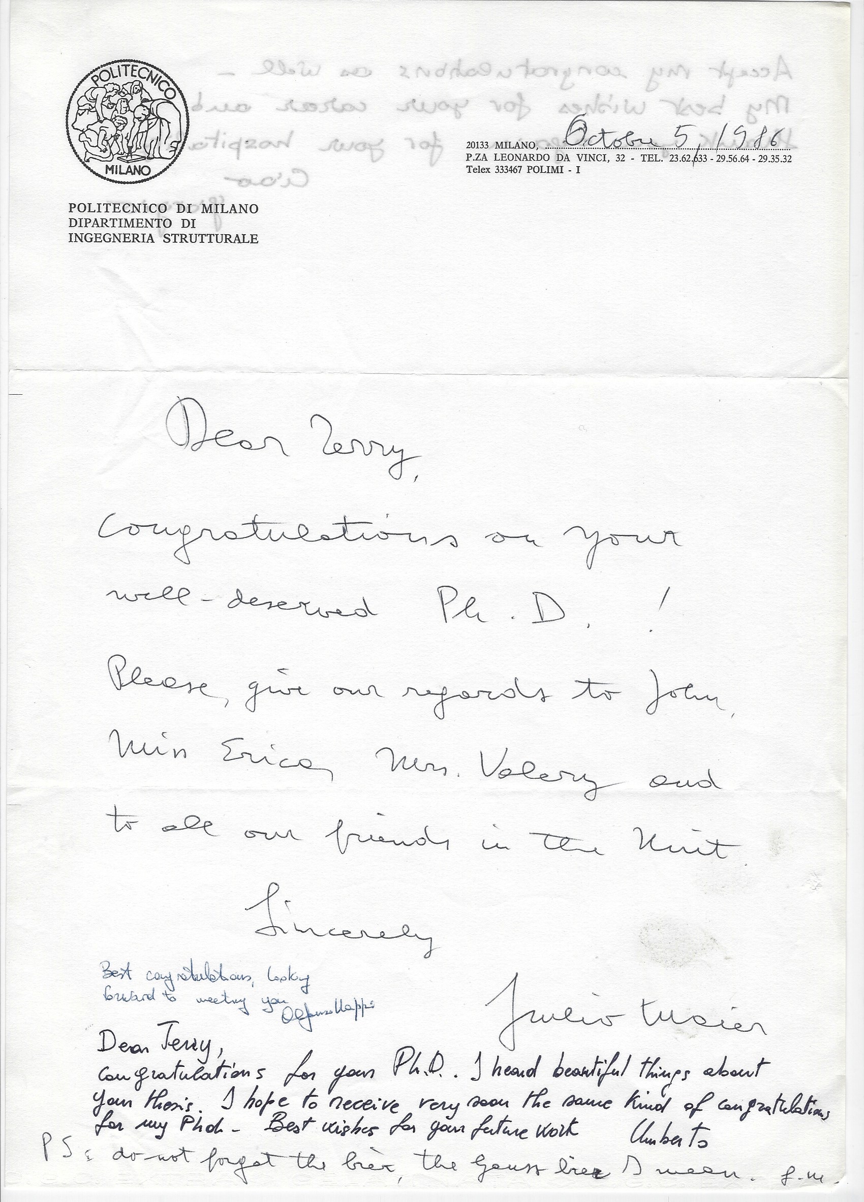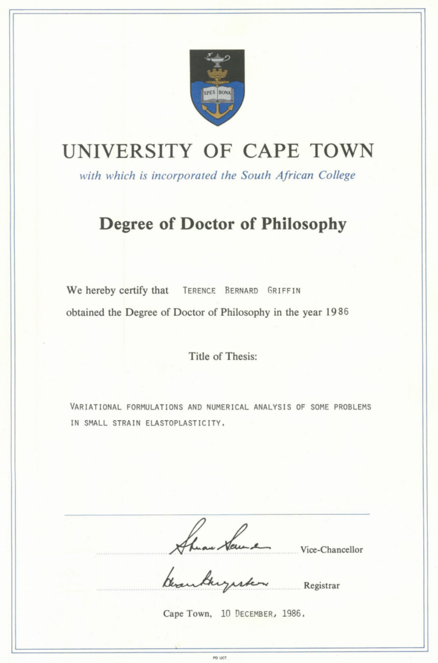 After a hectic two years at the grindstone I submitted my thesis in April 1986. I had three overseas external supervisors: Professor Guilio Maier from the Politecnico di Milano, professor JT Oden from the University of Texas at Austin, and professor ARS Ponter from the University of Leicester. Fortunately only one of them, Guilio Maier, examined me in person! When he did so (he was visiting UCT at the time) he said: "Terry, I don't understand your thesis so let's forget the exam and go and have a cup of tea!". I subsequently graduated in December 1986.