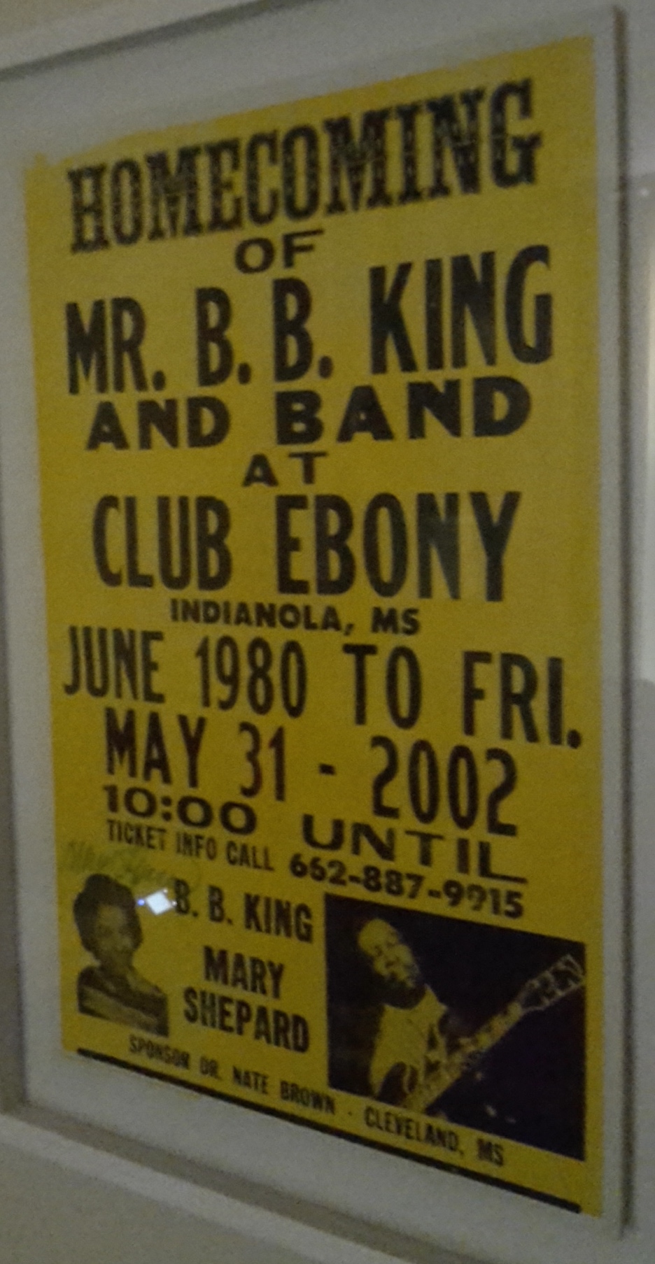 I stopped off in Indianola where BB King began his music career (he was purported to have been born in nearby Itta Bena). I got chatting to two black guys in a cafe and they told me BB King plays every year just down the road in a place called Club Ebony. I wandered down (it was late morning) and who should be sweeping the front porch but the owner Mary Shepard. She invited me in and told me all about the old days when she used to sing in BB's band right here. She gave me two original posters and signed them and told me to hang them on my wall. That's what I did and that's where they are!